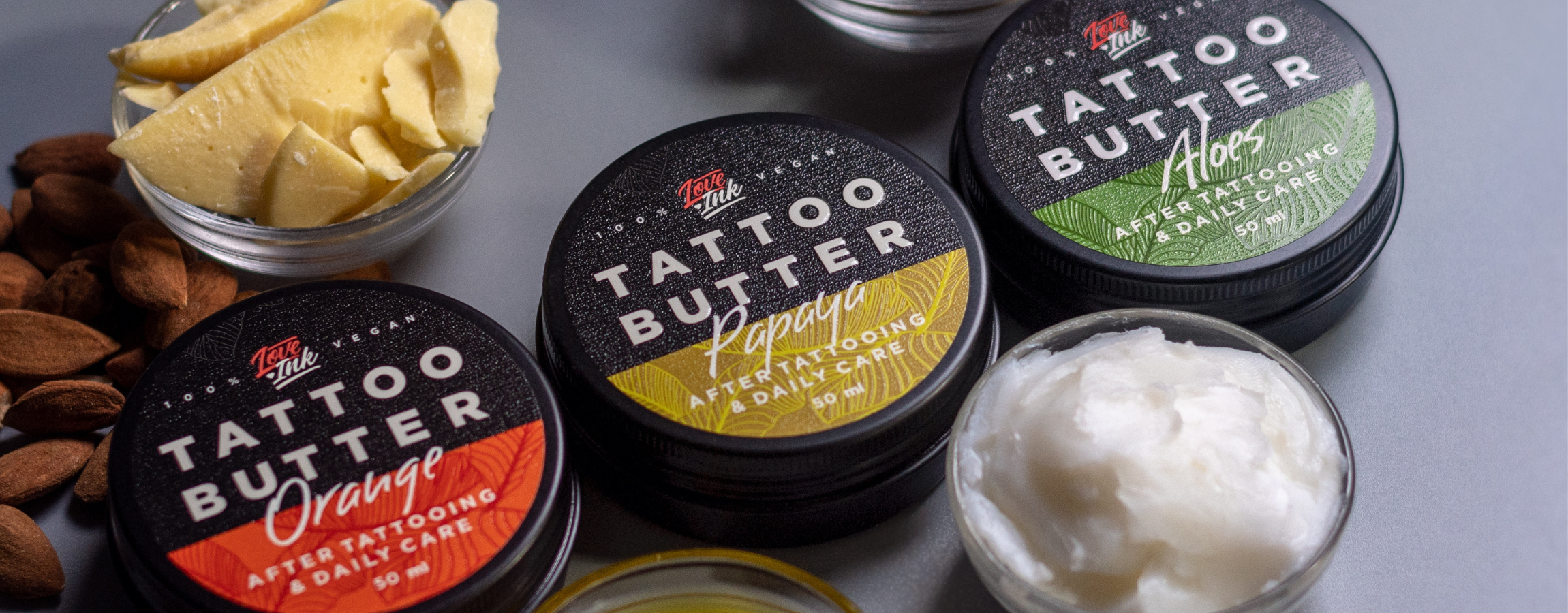 Naszą ofertę kierujemy zarówno do Ciebie – osoby, która ma jedną, dwie czy naście tatuaży, jak i tatuatorów, którzy chętnie polecają nasze produkty. Dlaczego? Bo nam ufają. Bo nasze kosmetyki do tatuażu powstały przy wykorzystaniu naturalnych składników – wyciągów z roślin, które solidnie nawilżają i odżywiają skórę. To właśnie sprawia, że tatuaże długo zachowują świetny wygląd – bez rozmytych konturów, czy blaknięcia.